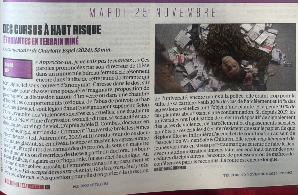 Si les étudiantes sont 5 fois plus victimes de violences sexistes et sexuelles que la moyenne des femmes, l’université serait-elle un terrain miné ? Ce film donne la parole à 5 étudiantes ou doctorantes, victimes de harcèlement ou de viol, qui se battent pour que les violences ne soient plus passées sous silence. Il suit aussi des associations qui tentent de briser l’omerta et porte un éclairage cru sur les dérives dans le monde de la recherche.
